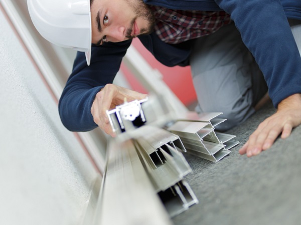 Operaio che lavora con profili in pvc per serramenti